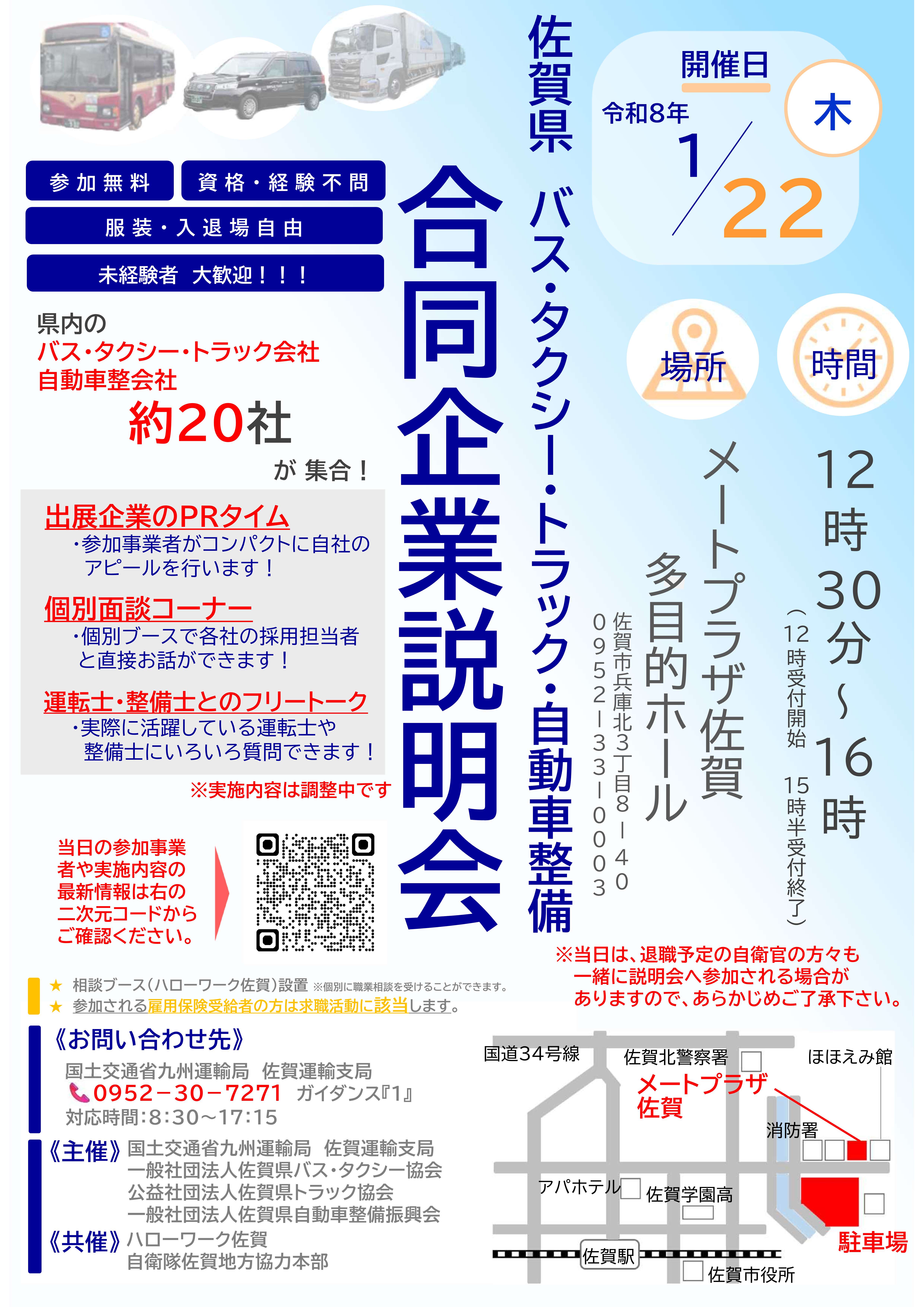佐賀運輸支局、一般社団法人佐賀県バス・タクシー協会、公益社団法人佐賀県トラック協会、一般社団法人佐賀県自動車整備振興会は、佐賀労働局およびハローワーク佐賀の協力のもと、バス・タクシー・トラック運転士及び自動車整備士の確保に向け、下記日程で「佐賀県バス・タクシー・トラック・自動車整備合同企業説明会を開催します。 佐賀県内のバス・タクシー・トラック会社、自動車整備会社 約20社が一堂に集結し、企業PRや対面式の個別面談を行います。 参加無料、服装・入退場自由、資格・経験不問ですので、お気軽にご参加ください!