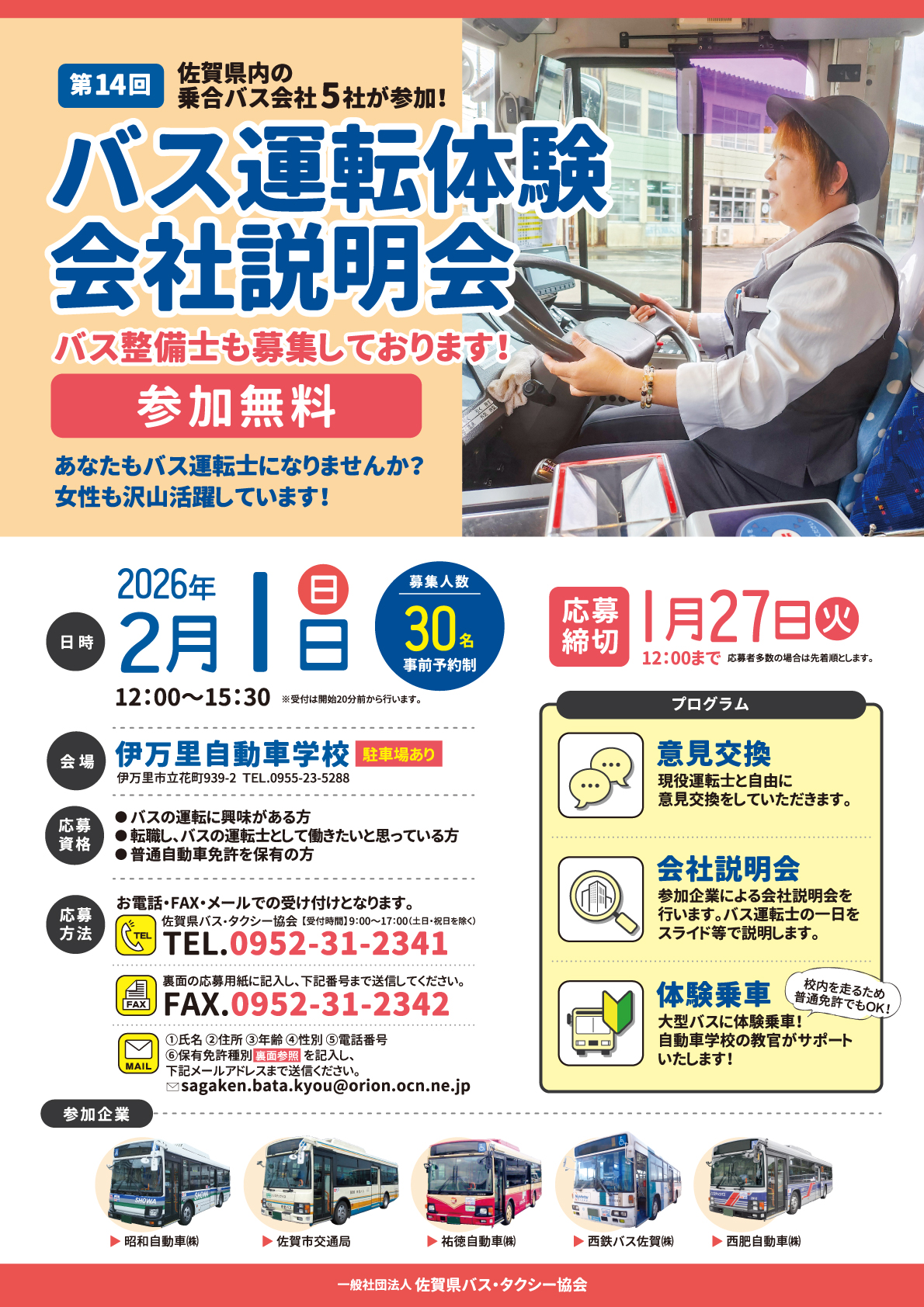 佐賀県内乗合バス5社による会社説明会、現役運転士との意見交換、大型バスの運転体験ができる参加無料のイベントです。 バスの運転に興味がある方、バス運転士として働きたいとお考えの方、ぜひ、ご参加ください!バス整備士も募集しております!
